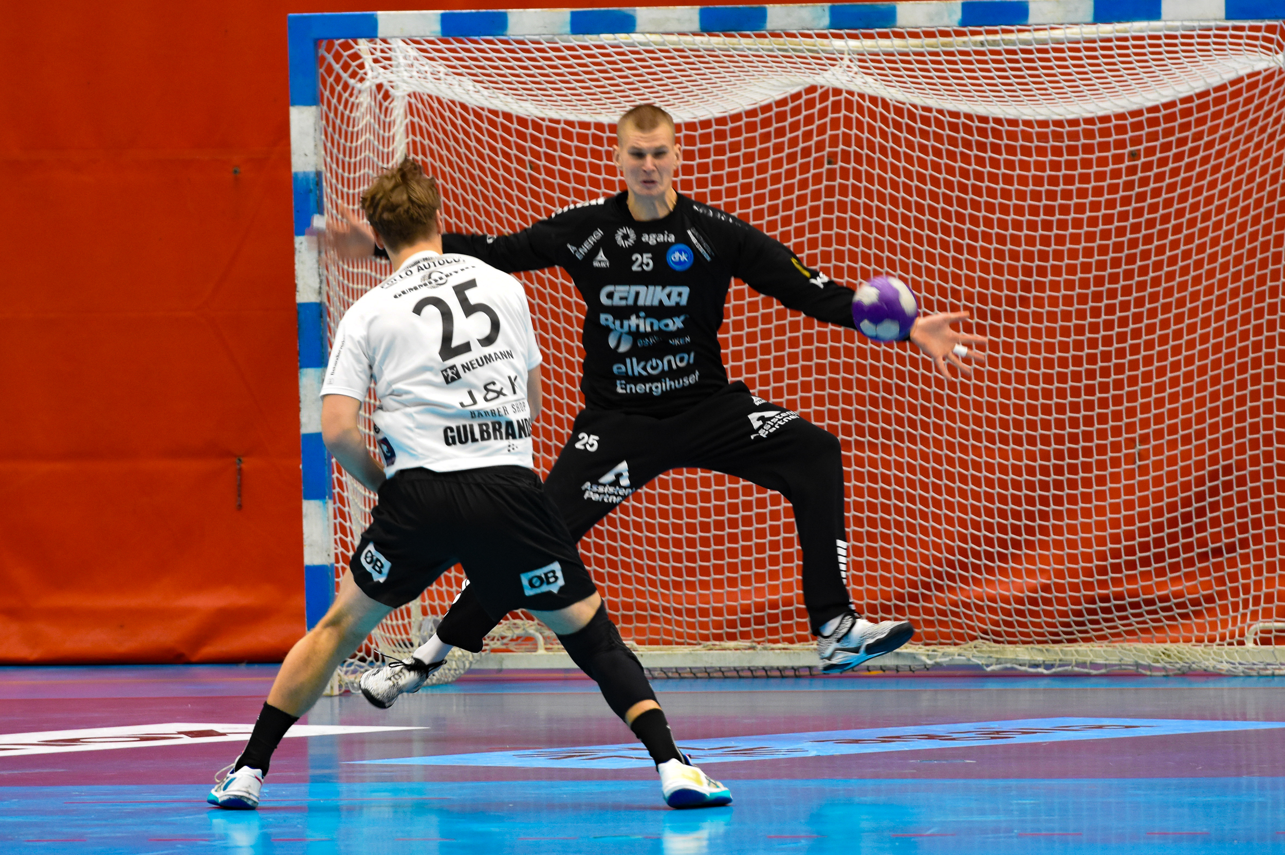 Oscar Larsen Syvertsen fikk tillit fra start mot Follo, og stoppet opp på en redningsprosent på hele 38. Her redder han et syvmeterkast fra Marius B. Gulbrandsen.
