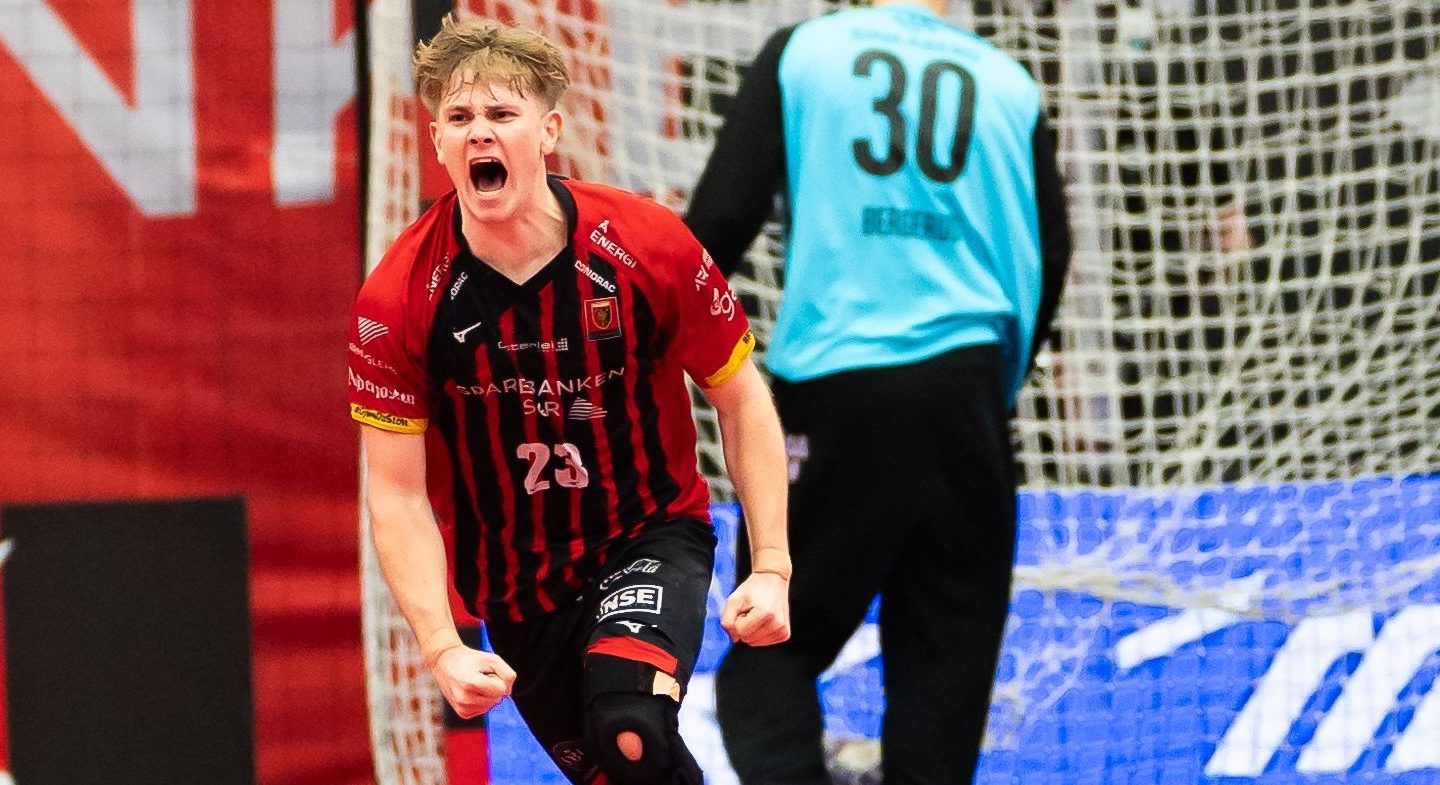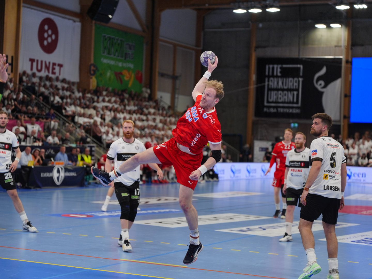 Kolstads Simon Jeppsson under den andre sluttspillfinalen i håndball mellom Kolstad og Elverum i Trondheim Spektrum. Foto: Ole Martin Wold / NTB