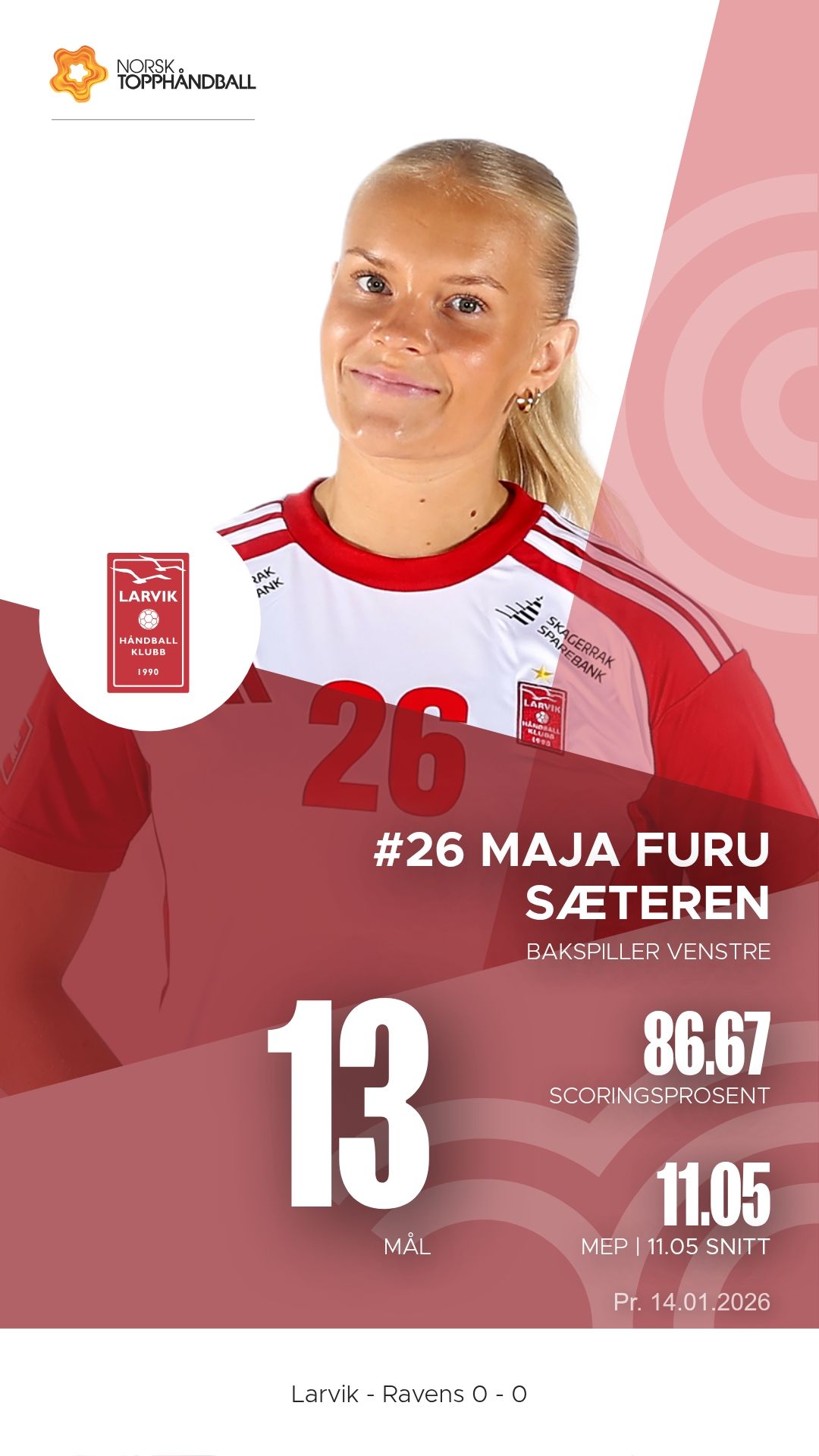 Maja Furu Sæteren var kampens mest effektive spiller med 13 mål og åtte assist fra bakspillerposisjon. Hun var motoren i Larviks angrepsspill og leverte både kraft og presisjon gjennom hele kampen. Hun ble kåret til banens beste i oppgjøret.
