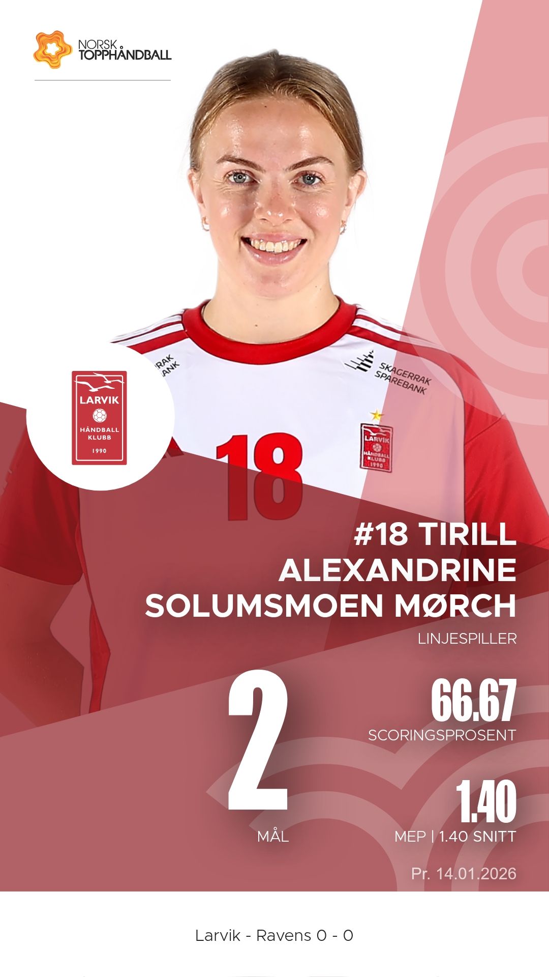 Ravens forsøkte å svare gjennom Anna Lunke Norum og Svensson, men de slet med å trenge gjennom Larviks forsvar. På motsatt side viste Frøydis Wiik Seierstad og Kine Hauge Kvalsund gode bevegelser og sikre avslutninger, mens strekspiller Tiril Birgitte Rosenberg bidro med to mål i løpet av kort tid. Larvik beholdt initiativet og lot aldri Ravens komme nærmere enn seks mål.