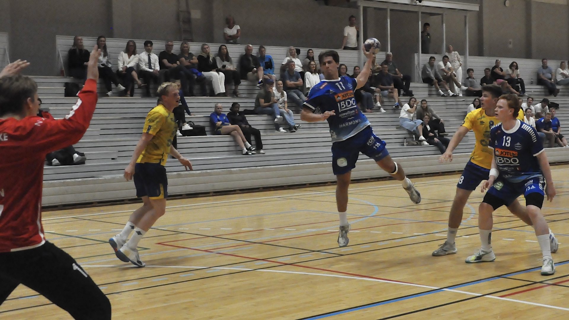 Sandefjord-kaptein Sander Wennberg Linderud i skuddet mot Bækkelaget. Foto: Sandefjord Håndball