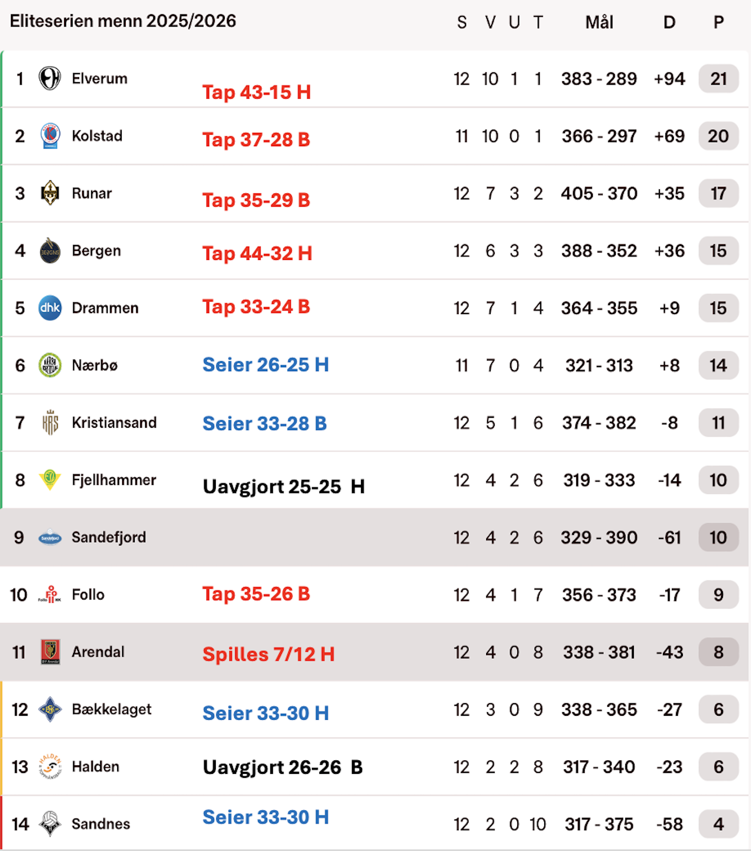Tabellen under er et tydelig bevis for at Sandefjord er gode nok for en plass i håndballens formel 1. Som nyopprykket fra 1. divisjon er det mange som har spådd direkte nedrykk for de blå, eller i beste fall en plass blant de to lagene som må spille kvalifisering om fortsatt plass i divisjonen.