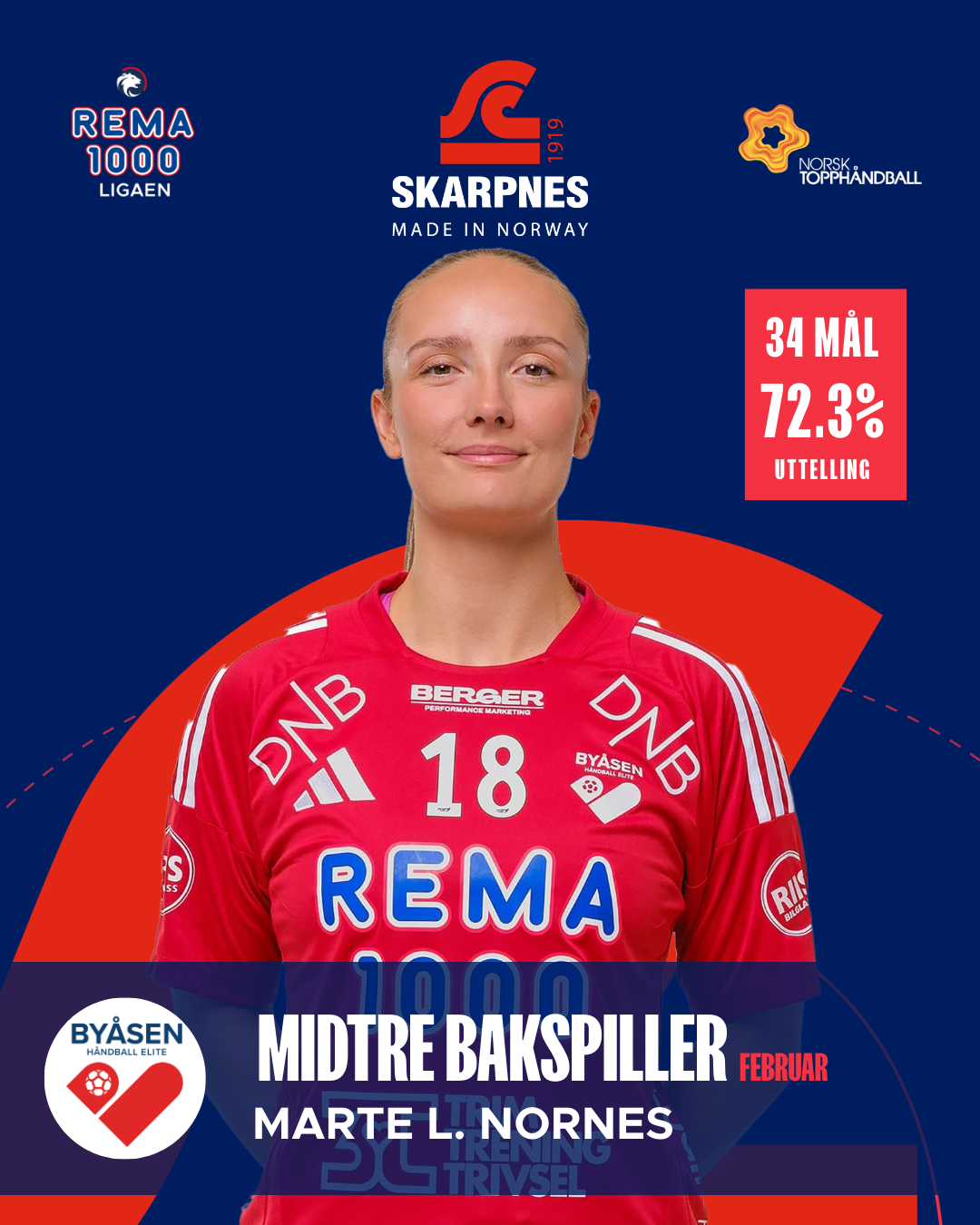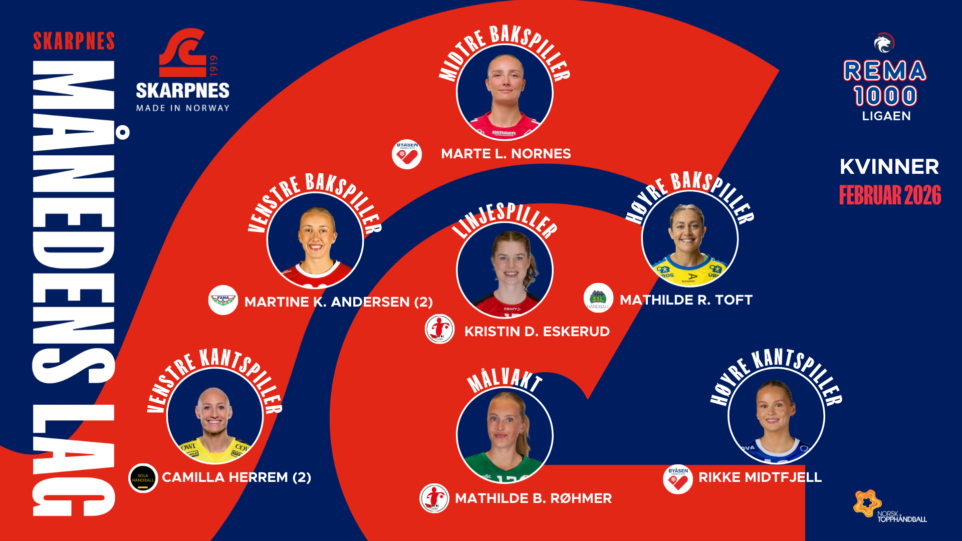 Kåringen av Skarpnes Månedens Lag er basert på statistikk fra kampene som er spilt i februar. Kun spillere som har deltatt i minimum tre kamper i løpet av måneden er vurdert. Februar har bydd på sterke enkeltprestasjoner, høy effektivitet og flere spillere som virkelig har tatt ansvar når det har stått og vippet. Her er månedens utvalgte i REMA 1000-ligaen for kvinner.