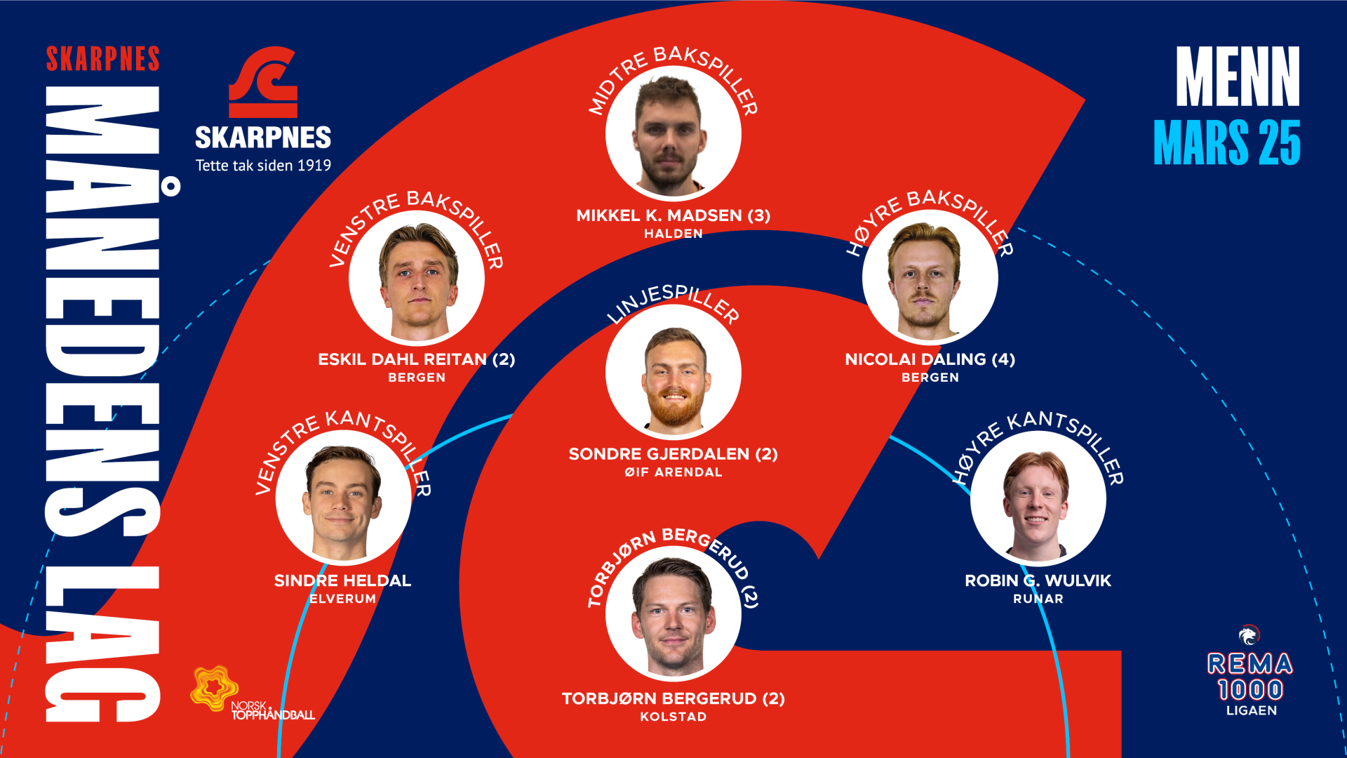 Her er spillerne som utmerket seg mest i sine posisjoner og tar plass på Skarpnes Månedens Lag for mars i REMA 1000-ligaen menn: