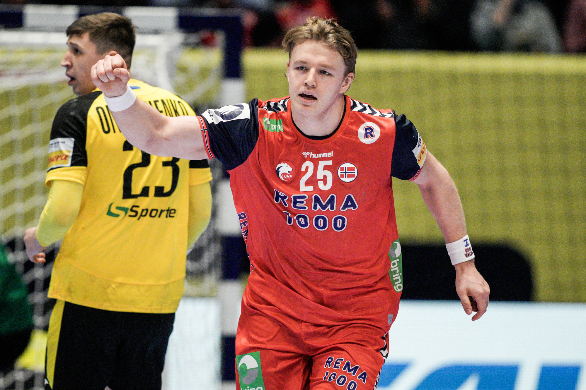 Norges Patrick Anderson etter EM-kampen i håndball mellom Norge og Ukraina i Unity arena. Høyrebacken ble toppscorer og Norges beste spiller i det som var Follo-guttens mesterskapsdebut.