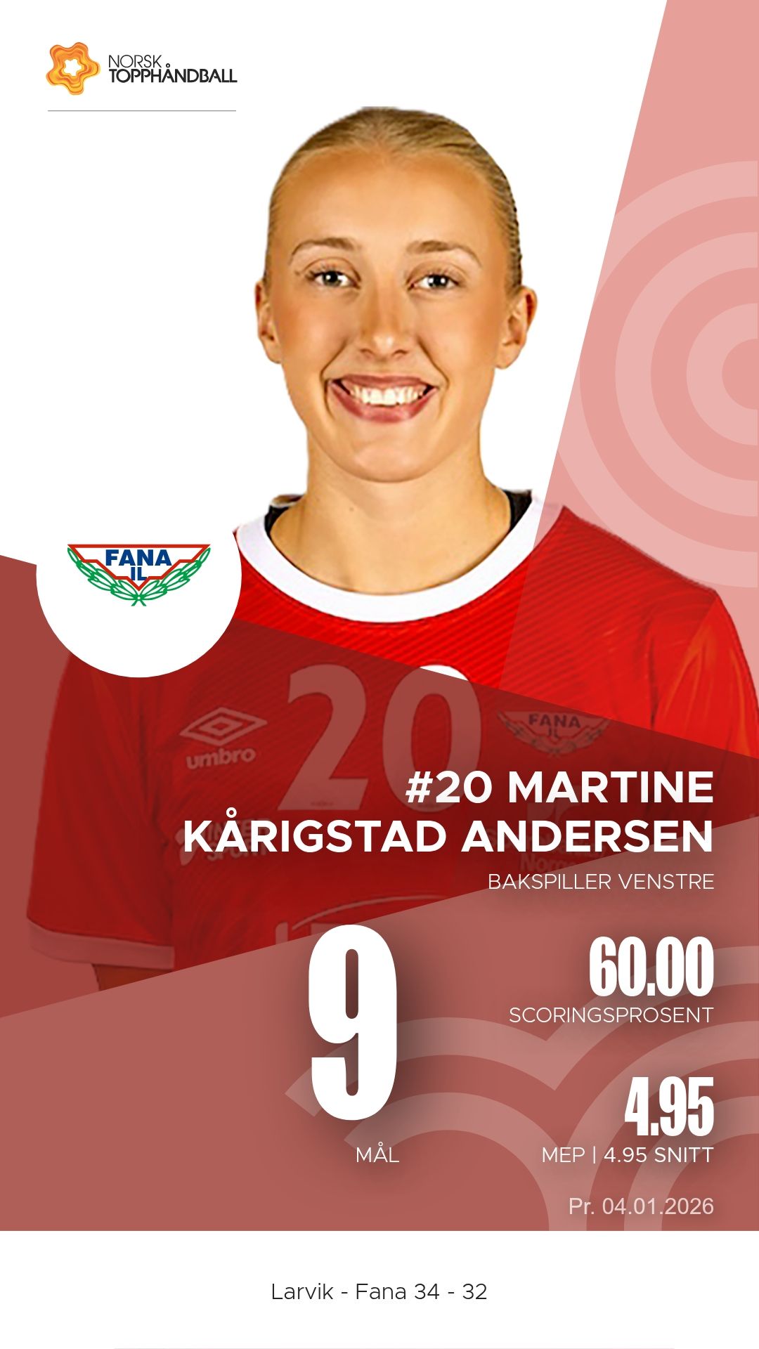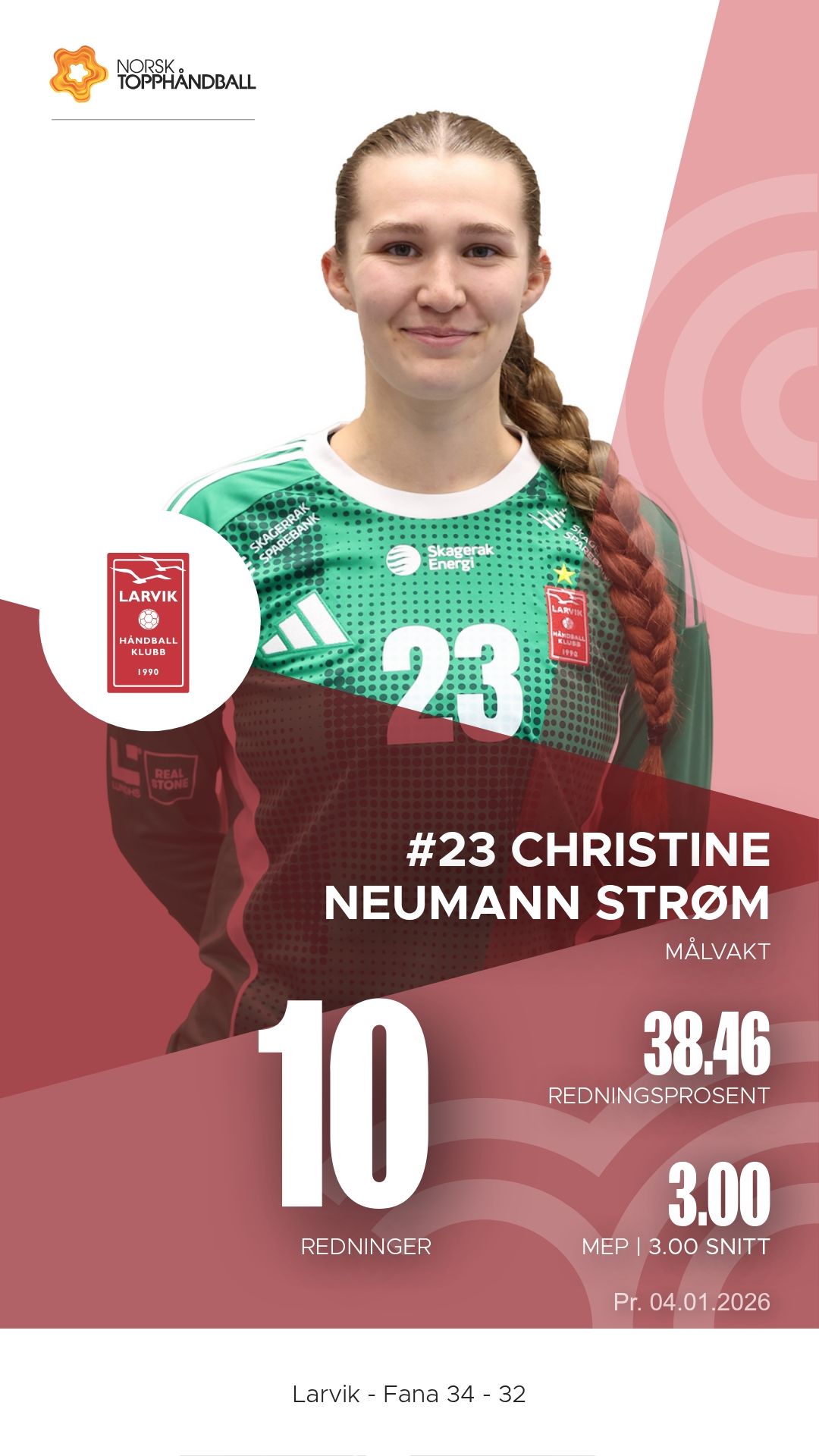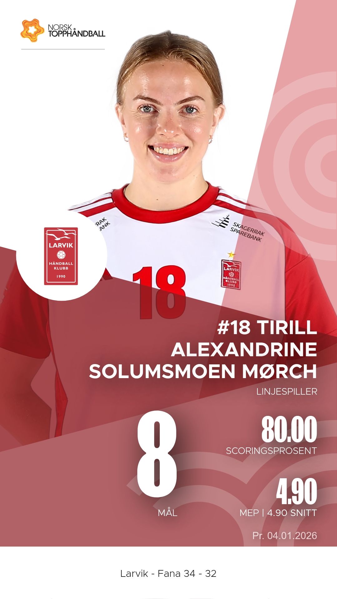 Christina Pedersen ble Larviks mest effektive spiller med fem mål og hele elleve assists fra sin bakspillerrolle. Hun var lagets motor og dirigent gjennom hele kampen. Tirill Alexandrine Solumsmoen Mørch var igjen en bauta på linja med åtte scoringer og konstant press på Fanas forsvar.