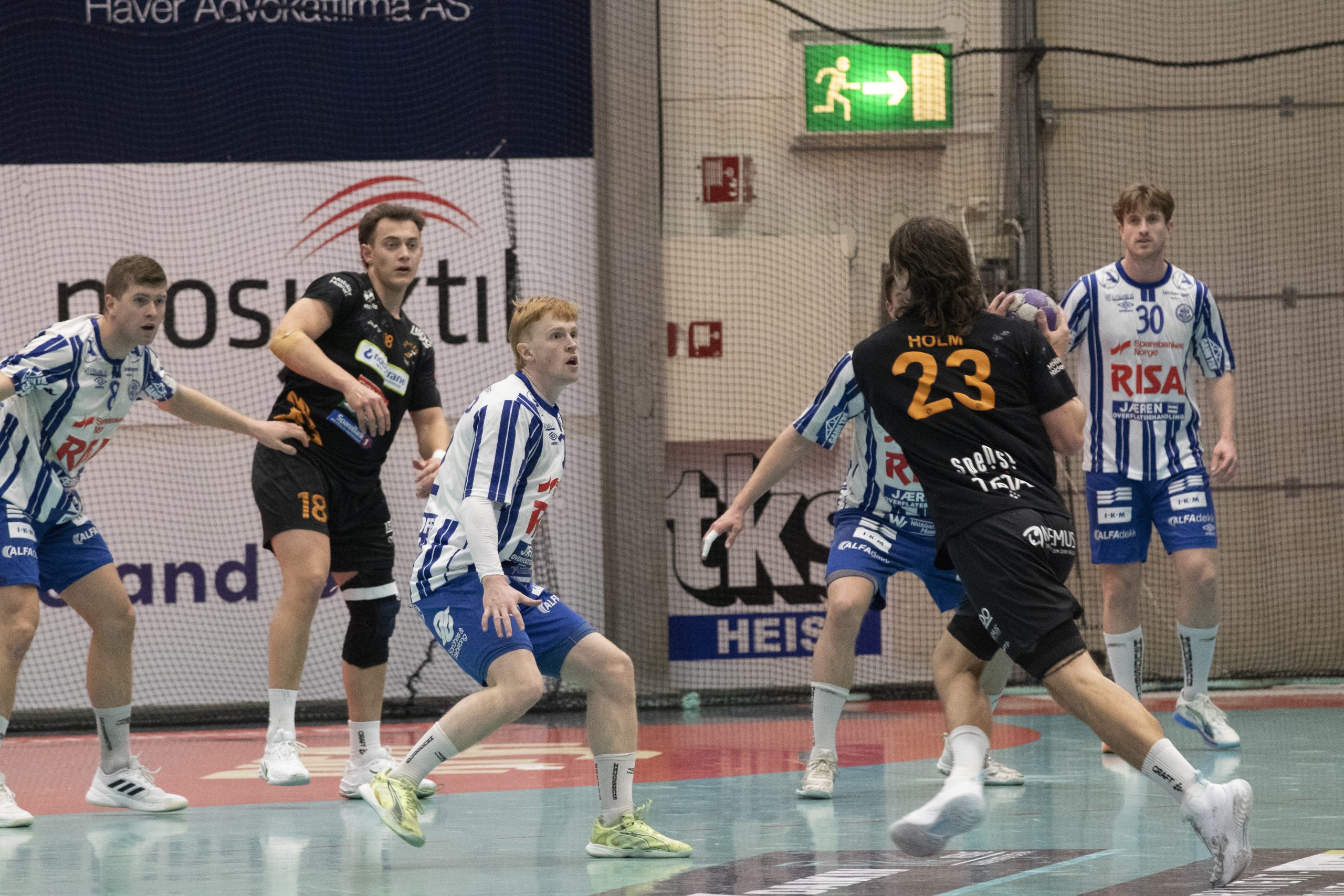 Intens forsvarsjobbing, f.v. Andreas Horst Haugseng, Kristian Turmo Lonstad (18), Kasper Lothe, Benjamin Holm (23), Vetle Mellemstrand Bore sog John Thue.