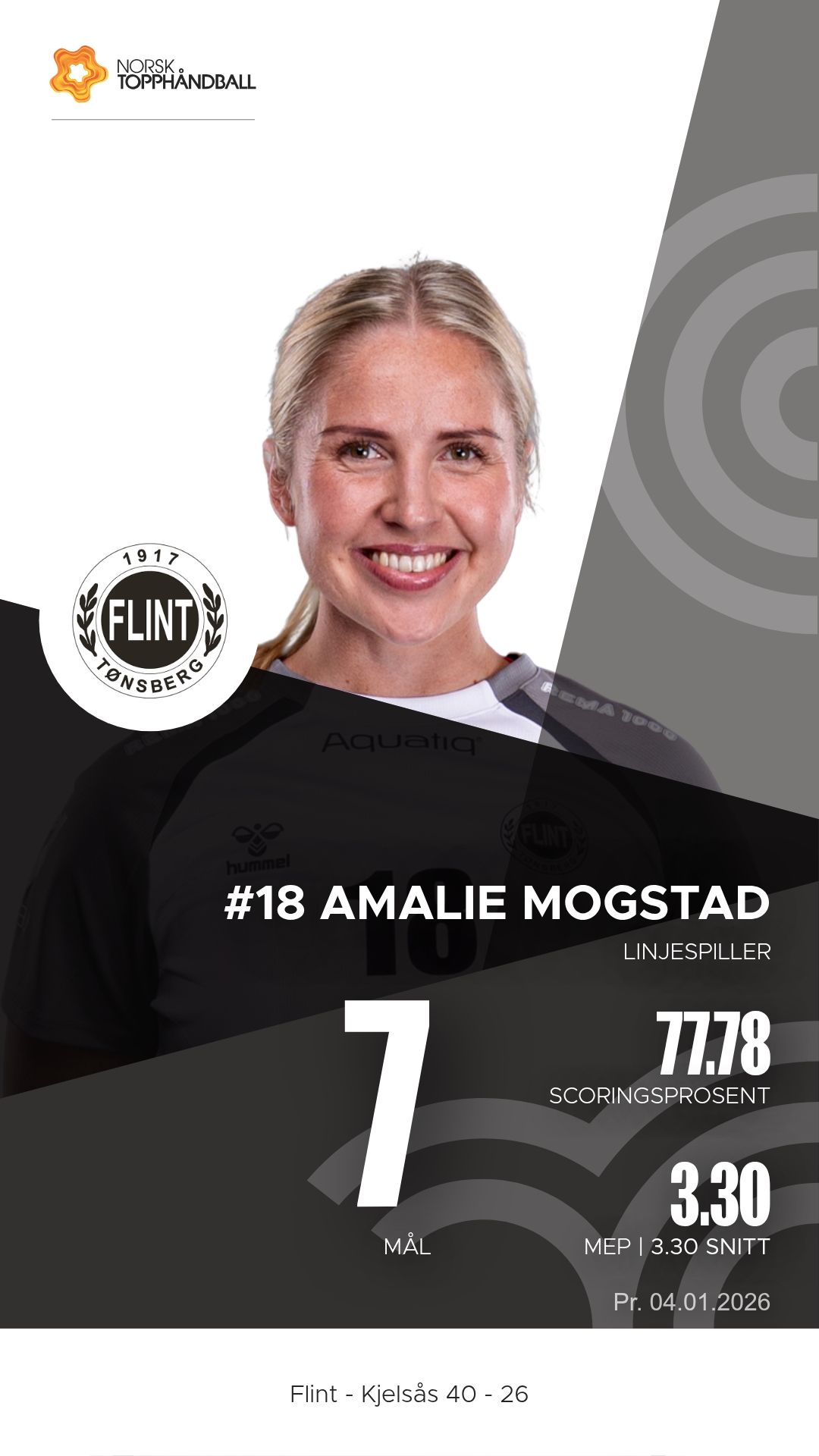Flint Tønsberg tok en overbevisende hjemmeseier mot Kjelsås i REMA 1000 Arena søndag 4. januar 2026. Kampen i 1. divisjon endte 40–26 etter at hjemmelaget ledet 23–10 ved pause.