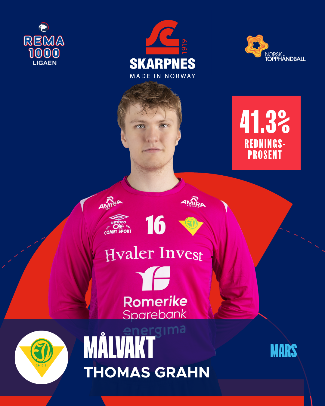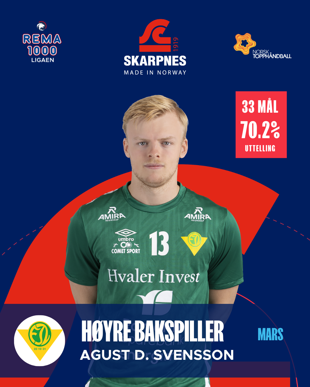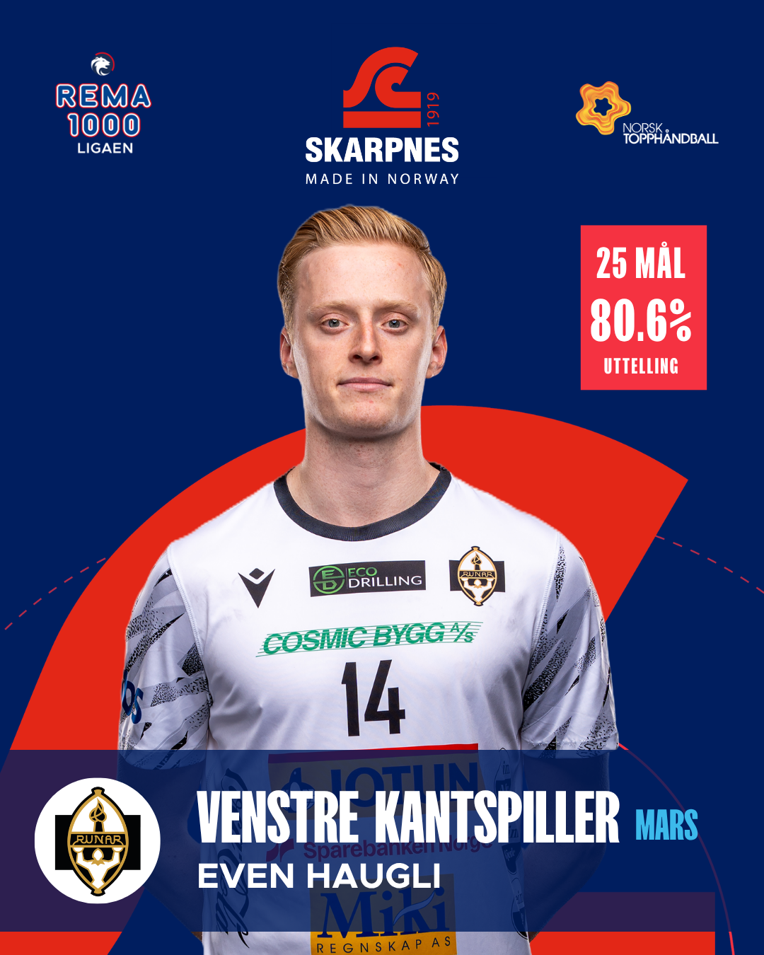 Haugli har vært sylskarp fra venstrekanten i mars og levert mål på løpende bånd. Med 25 scoringer og en uttellingsprosent på hele 80,6 %, har han vært en konstant trussel. Snittet på 6,3 mål per kamp viser en spiller i storform, samtidig som han bidrar med energi og tempo i Runars angrepsspill.