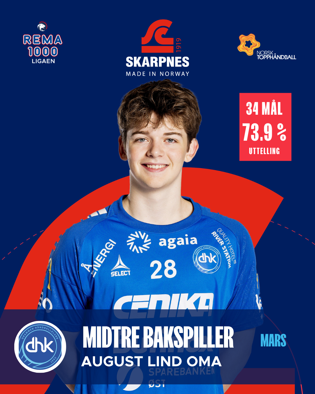 Drammens playmaker har vært en av ligaens aller mest toneangivende spillere i mars. Med både 34 mål og 24 assists styrer han spillet med autoritet og kreativitet. Et imponerende MEP-snitt på 7,2 er meget høyt, og hans evne til å både avslutte og tilrettelegge gjør ham uvurderlig. Dette er tredje gang denne sesongen han er med på Skarpnes Månedens Lag.
