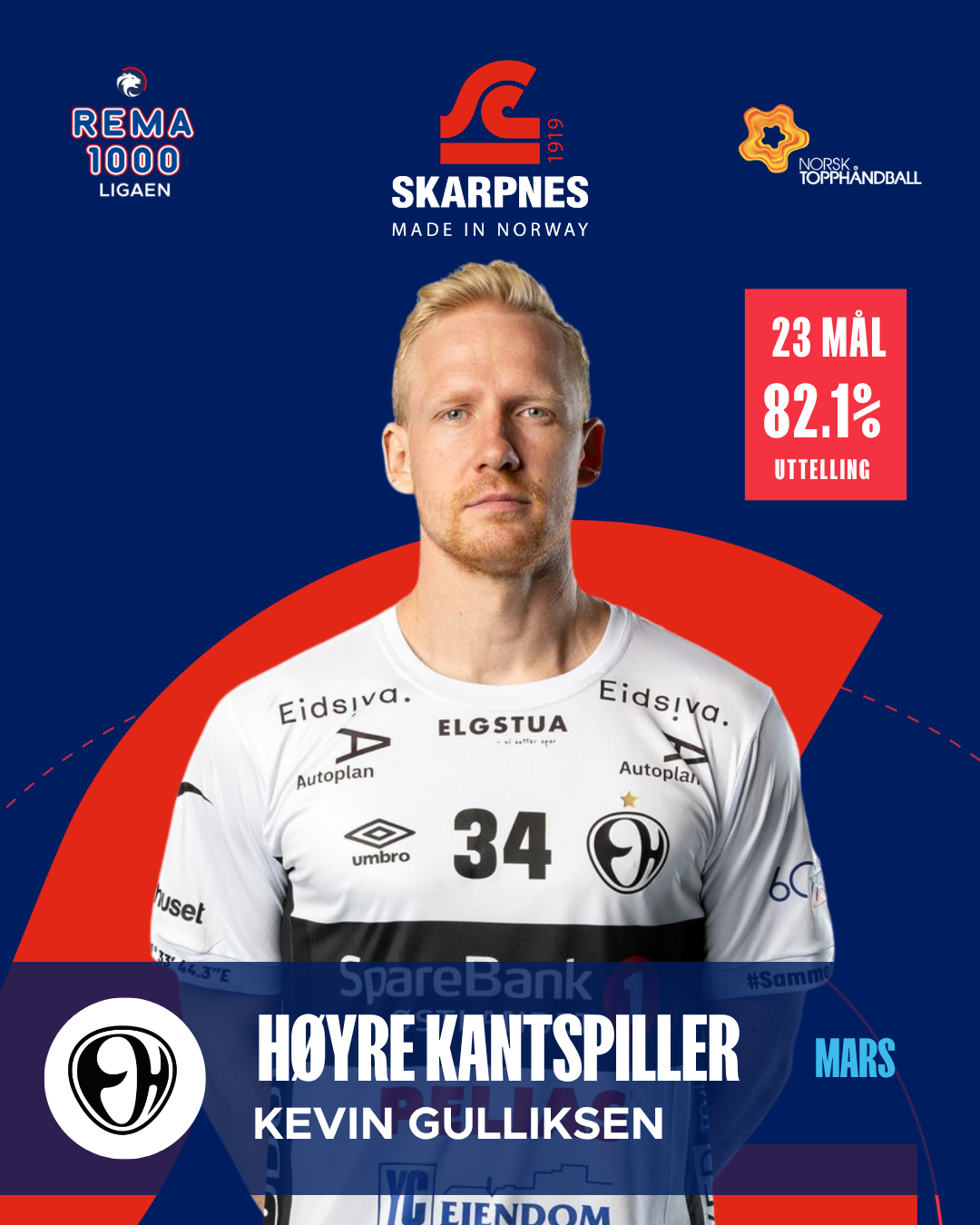 Gulliksen har vært ekstremt effektiv i sine tre kamper i mars. Med 23 mål og en uttellingsprosent på sterke 82,1 %, har han utnyttet sjansene sine til det fulle. Snittet på 7,7 mål per kamp vitner om en spiller i toppslag, og han har vært en avgjørende bidragsyter for Elverum.