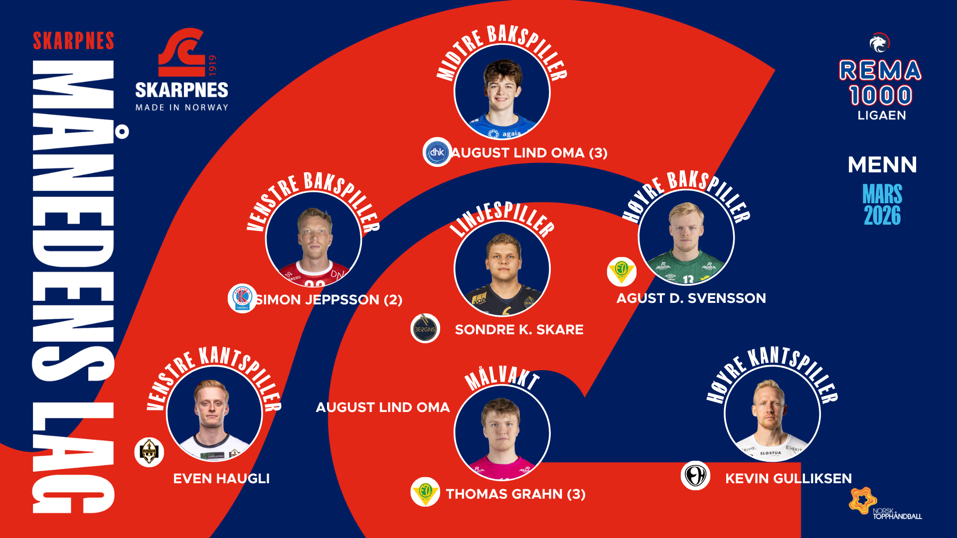 Totalt 26 kamper er spilt i REMA 1000-ligaen for menn i mars, og basert på sterke prestasjoner og statistikk er Skarpnes Månedens Lag nå kåret. Flere spillere har markert seg med toppnivå over tid. Vi gratulerer alle spillere!