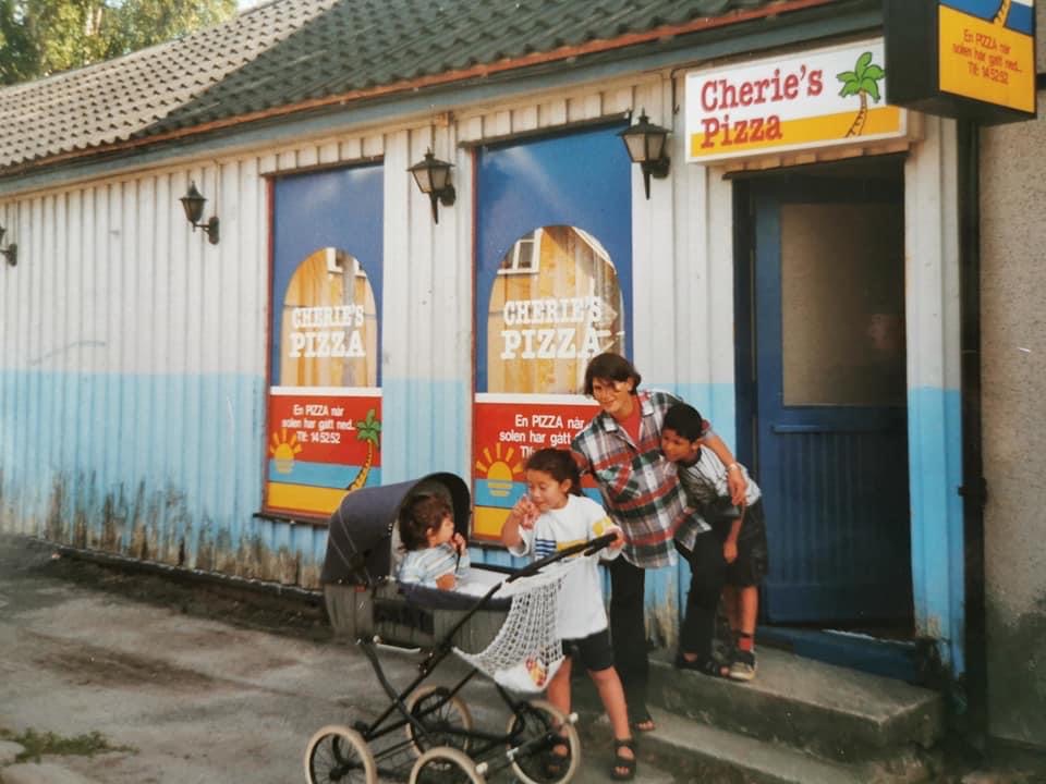 Pappa Farid, med Jonas, Sonia og Mounir utenfor pizzeriaen på Greåker i år 2000. Foto: Privat.
