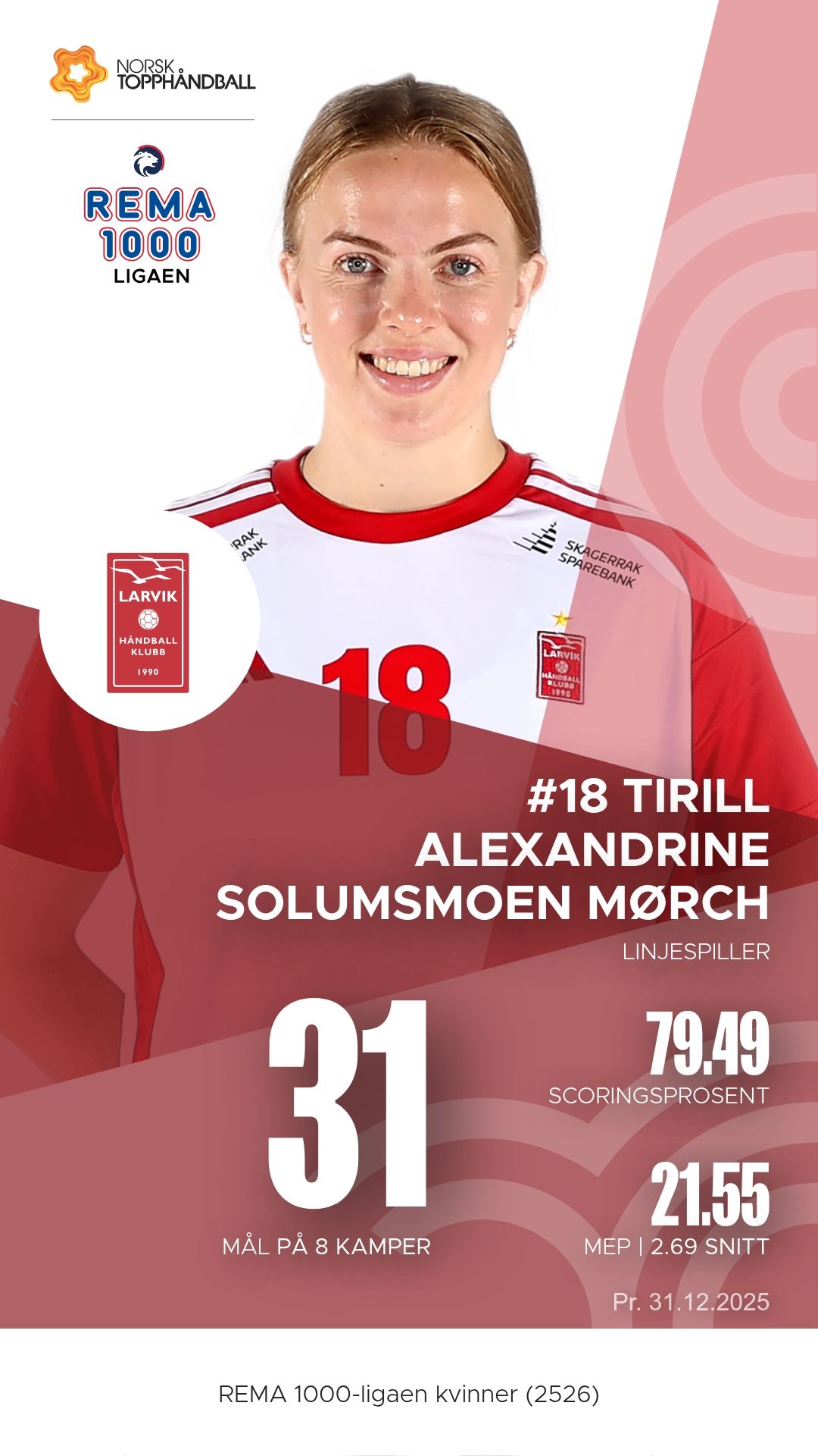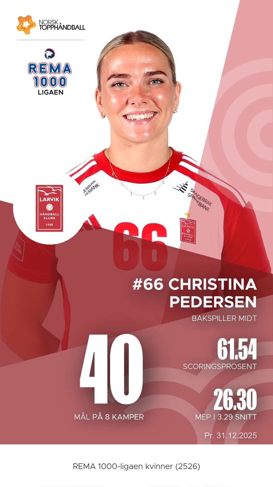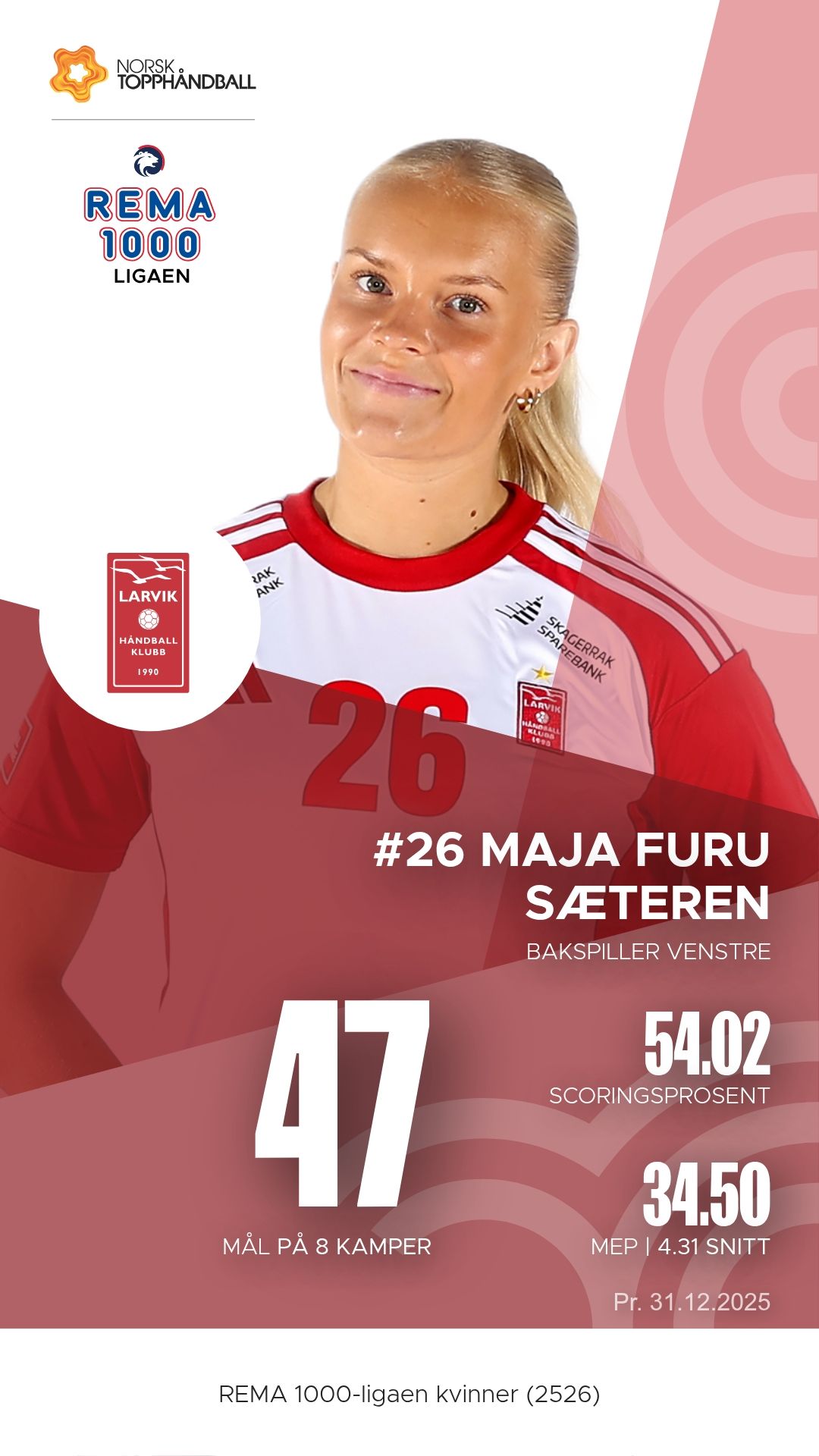 Hos Larvik er det liten tvil om hvem som leder an. Maja Furu Sæteren har vært lagets motor og x-faktor gjennom sesongen, med både målinstinkt og pasningsblikk som setter standarden for resten av laget. Christina Pedersen styrer spillet fra midten med ro og presisjon, og er ofte den som finner åpningene i motstanderens forsvar. På linja står Tirill Alexandrine Solumsmoen Mørch frem som en bauta – sterk i duellene og effektiv på avslutningene.
