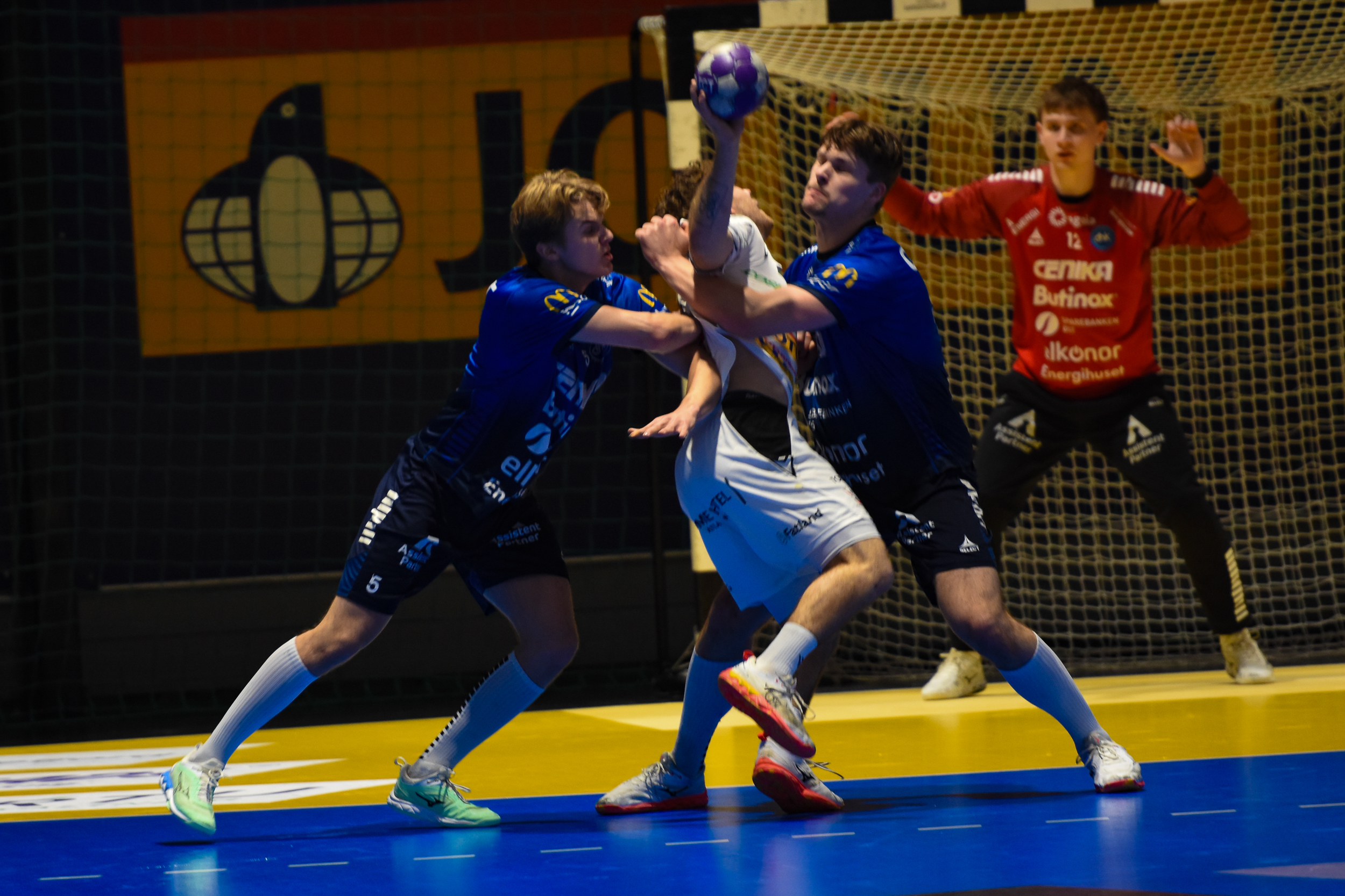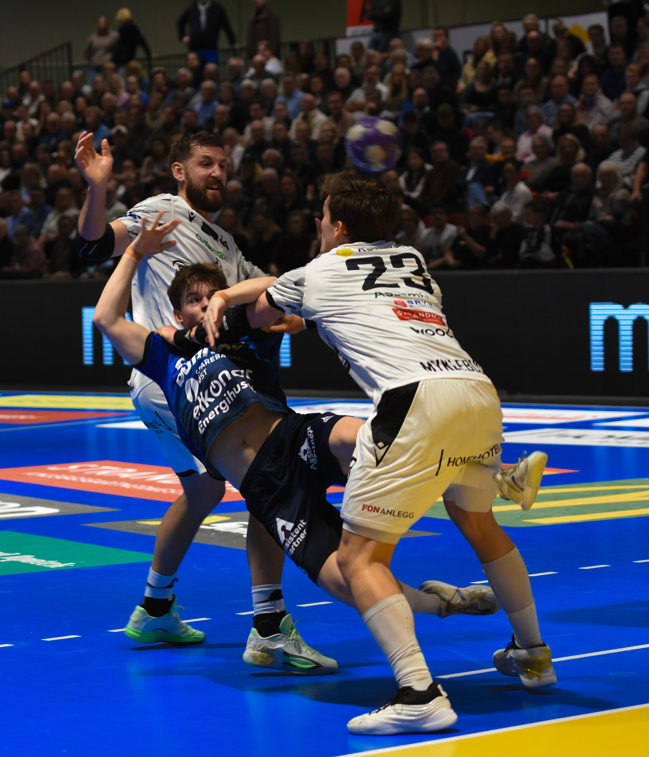 August Lind Oma har regien i DHKs angrepsspill, både i seks mot seks, og syv mot seks. Denne gangen ble han effektivt stoppet tidlig i angrepene av sterke Runar-forsvarere. Her er det Tobias Rivesjö og Sander Myklebust som i fellesskap har fanget ham opp på armene.