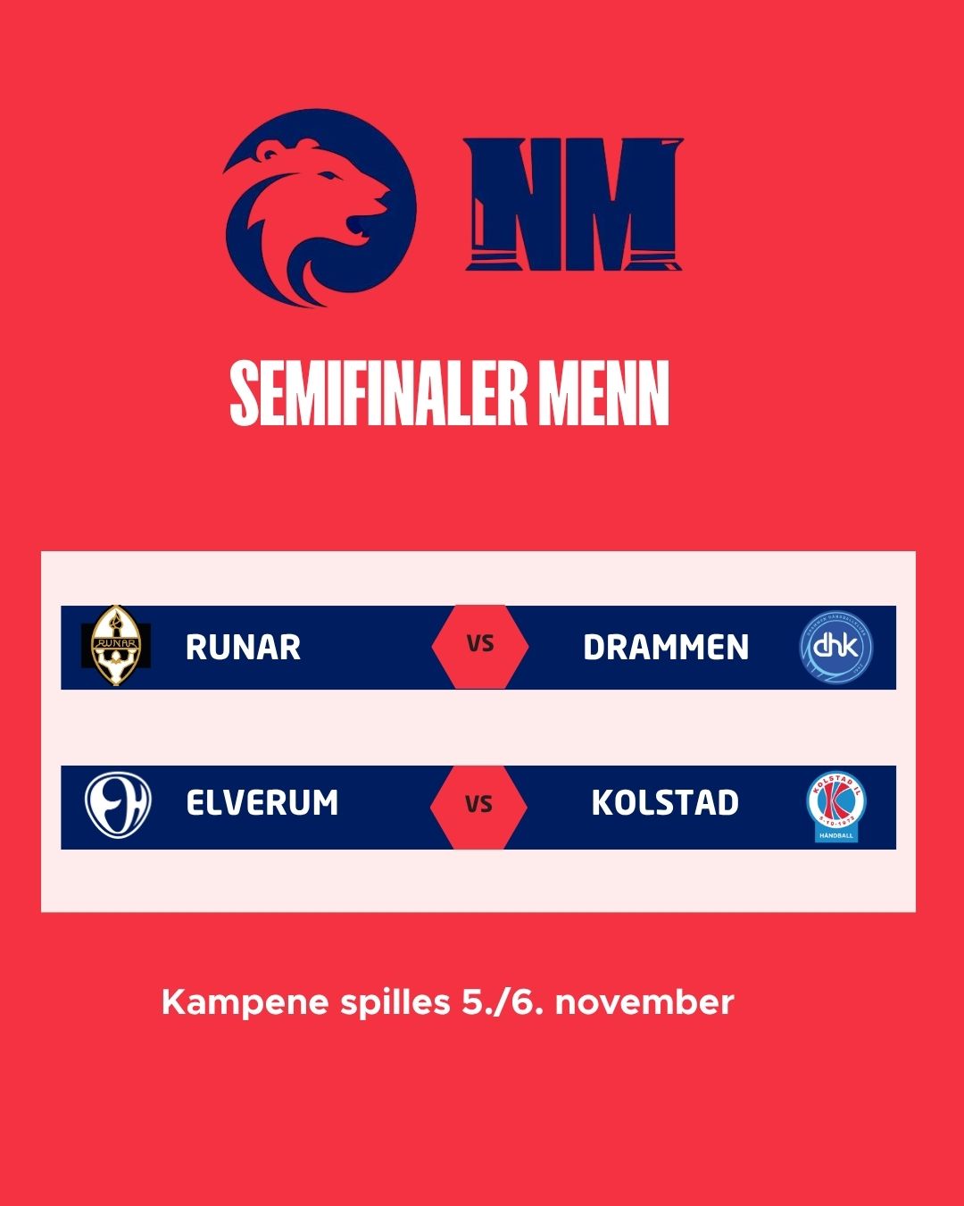 I semifinalene møtes Drammen og Runar, mens Elverum tar imot Kolstad hjemme i Terningen arena.