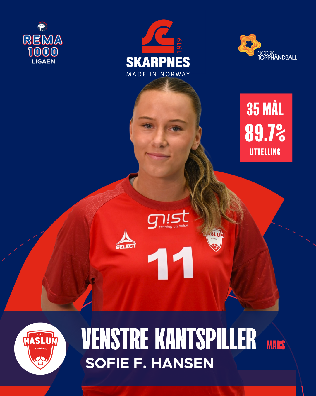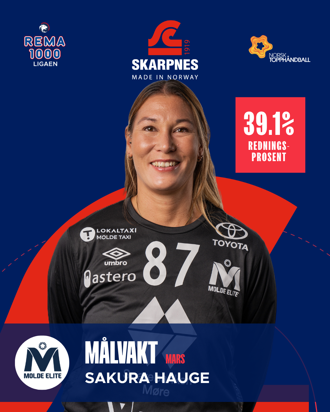 Molde-keeperen leverte en solid måned mellom stengene. Med 68 redninger på seks kamper og en redningsprosent på 39,1 var hun en viktig årsak til at laget sto godt i flere oppgjør. Hauge kombinerte stabilitet med avgjørende redninger når det gjaldt, og med et snitt på 3,3 i MEP holdt hun et jevnt høyt nivå gjennom hele mars.