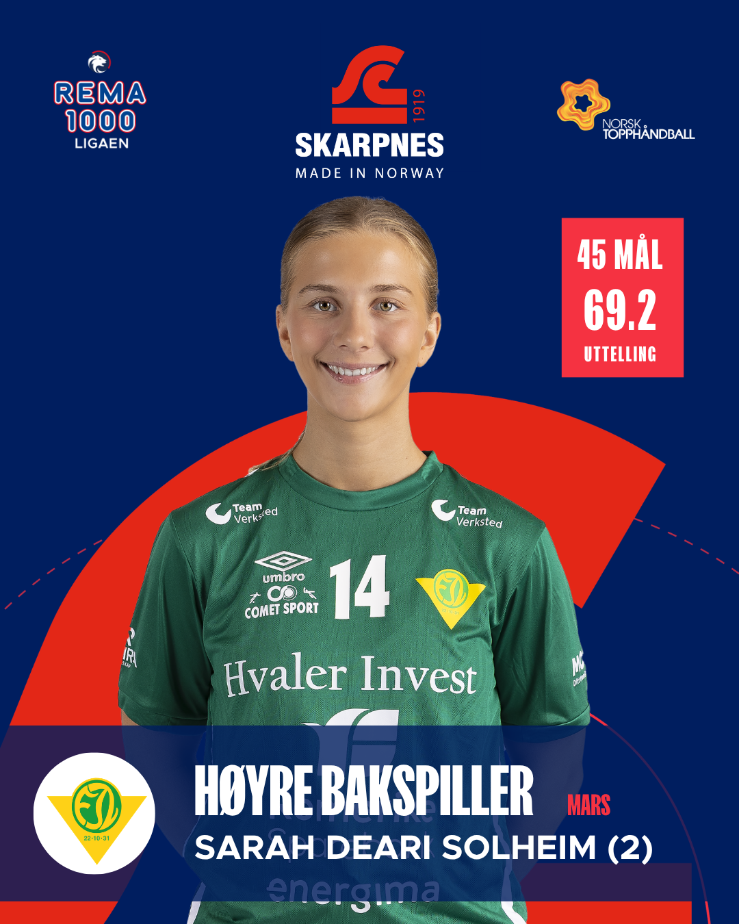 Solheim sto for en av månedens mest imponerende prestasjoner. Med 45 mål og 33 assists på fem kamper var hun en konstant trussel i Fjellhammers angrep. Ni mål i snitt per kamp og en uttellingsprosent på 69,2 viser både volum og kvalitet. Med 6,6 i snitt MEP var hun blant de aller mest dominerende spillerne i mars.