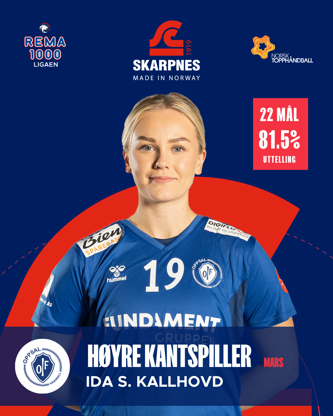 Kallhovd leverte igjen solid fra høyrekanten. På fire kamper scoret hun 22 mål, med en uttelling på 81,5 prosent. Med 3,5 i snitt MEP leverte hun stabilt gjennom hele måneden.