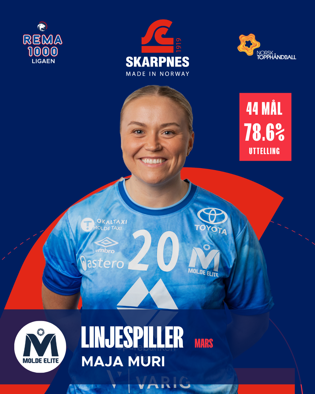 På linja var Muri en sentral brikke for Molde. Hun scoret 44 mål på seks kamper og hadde en uttellingsprosent på 78,6. I tillegg bidro hun med sju assists og mye fysisk tilstedeværelse i duellspillet. Med 4,8 i snitt MEP var hun en stabil og viktig faktor i lagets prestasjoner gjennom mars.